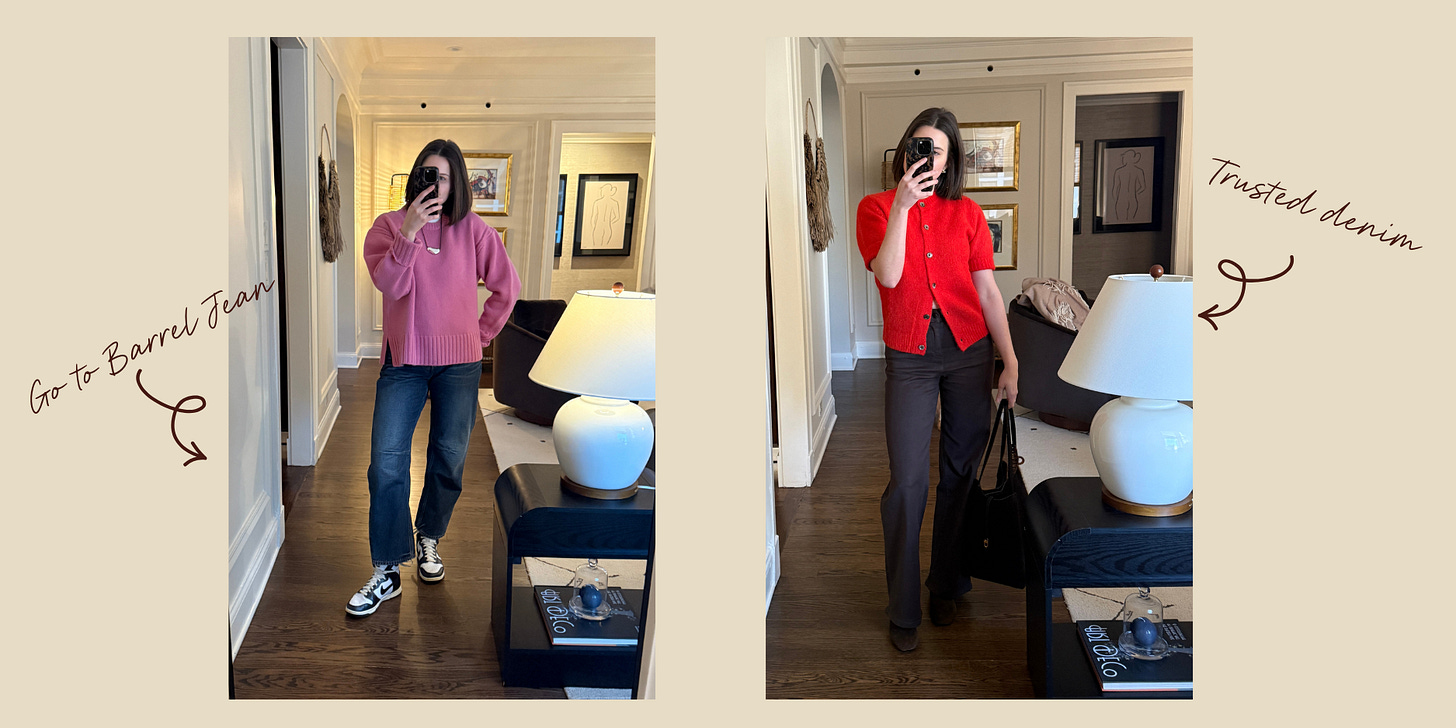 I’m sitting more than usual, so comfort is non-negotiable. Barrel-leg pants and trusted denim have been moved to the front of my closet — a physical reminder that clothes should meet you where you are. These pieces have always had a clear role for me: structure, ease, and presence. That hasn’t changed. (For those of you following along, these are my everyday interest jeans. More on my denim strategy here.)