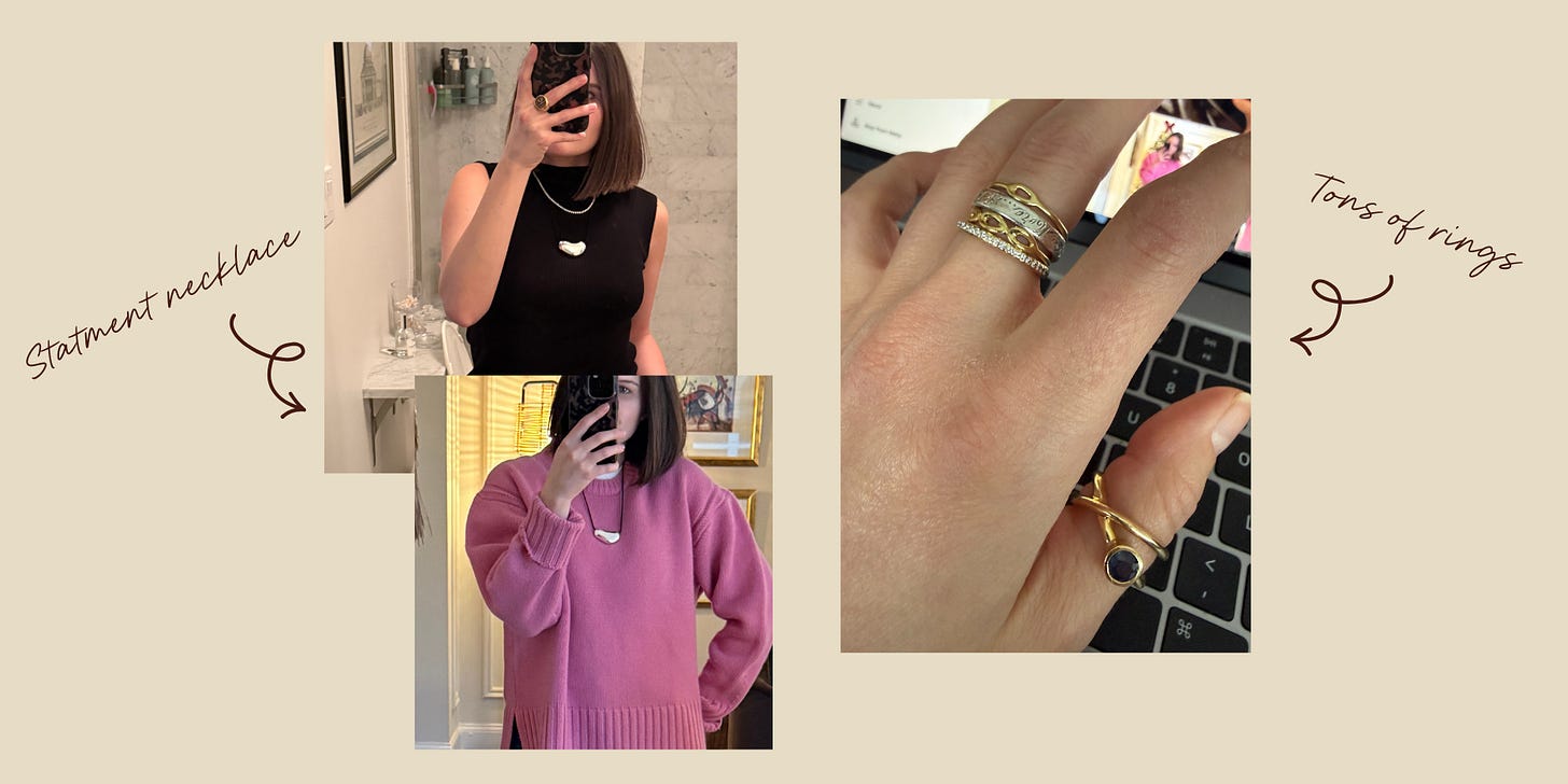 Simple doesn’t mean unfinished. My current formula is one statement necklace and tons of rings. No stacking decisions, no overthinking. There is no wrong way to layer rings and one bold necklace makes the perfect statement. Just enough structure to feel complete. Low effort, high reward strategy.