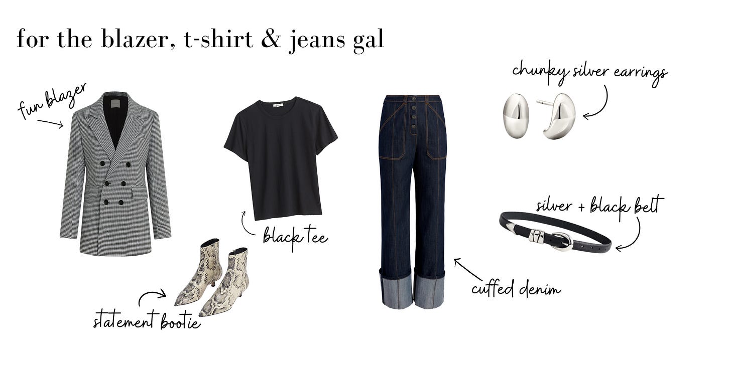 👉 Example: If you’re a blazer + tee + jeans kind of girl, swap your standard blazer for one in a houndstooth print, a vibrant color, or even leather. That one switch makes your outfit instantly more styled.