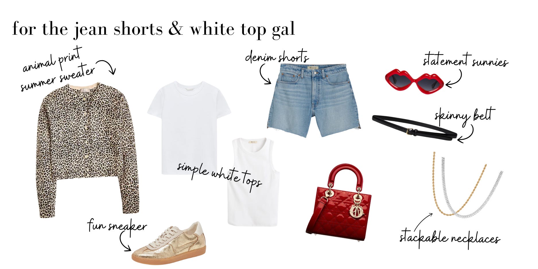 👉 Example: If your outfit is a tank top + denim shorts, stack on layered necklaces to fill in the neckline, add statement rings, and throw on an oversized pair of sunnies for an effortlessly cool vibe.