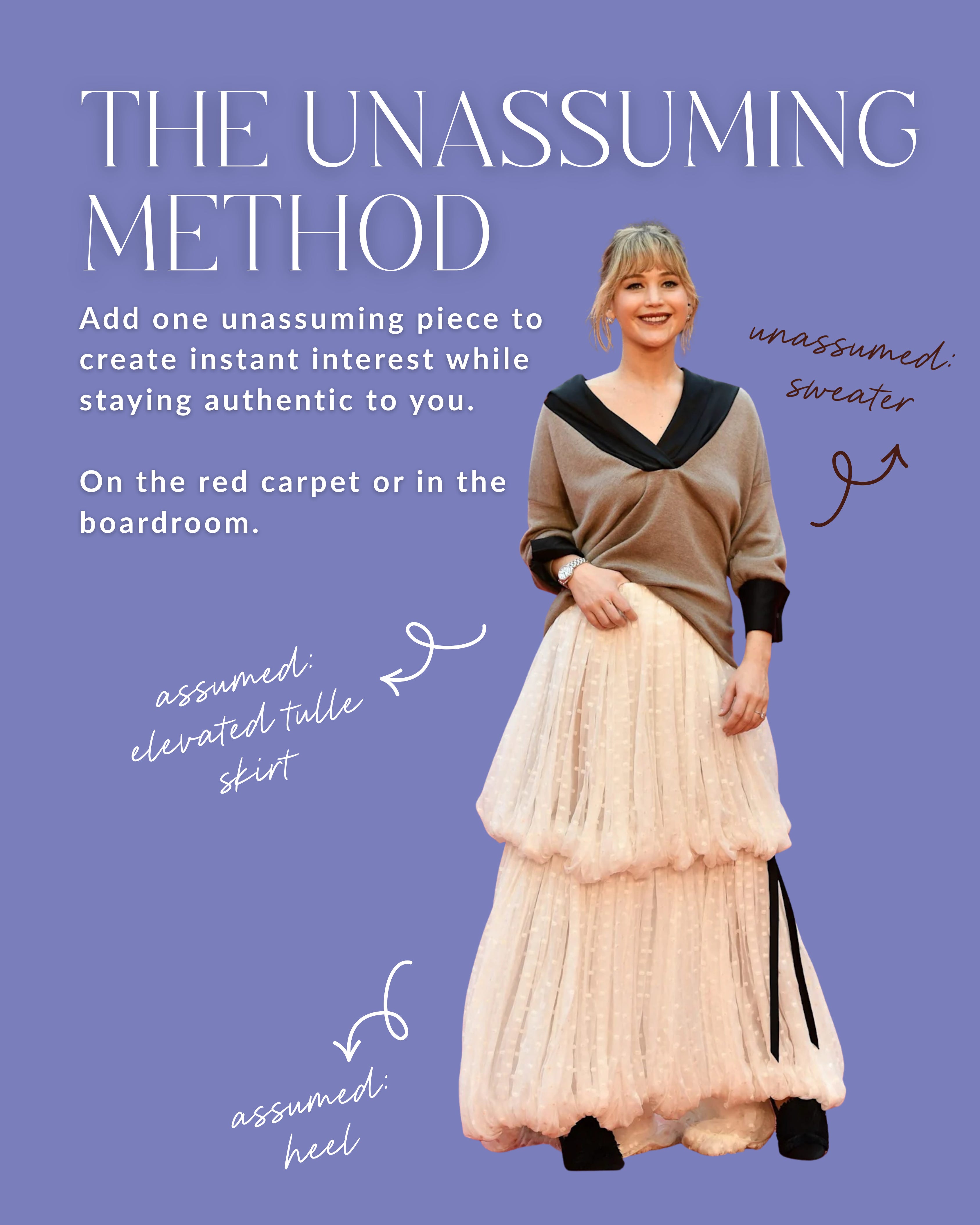 Most people would say a tulle skirt and oversized sweater don’t belong on the red carpet. But JLaw proved them wrong—and in doing so, she demonstrated what I’ve been teaching clients for years: The Unassuming Method.