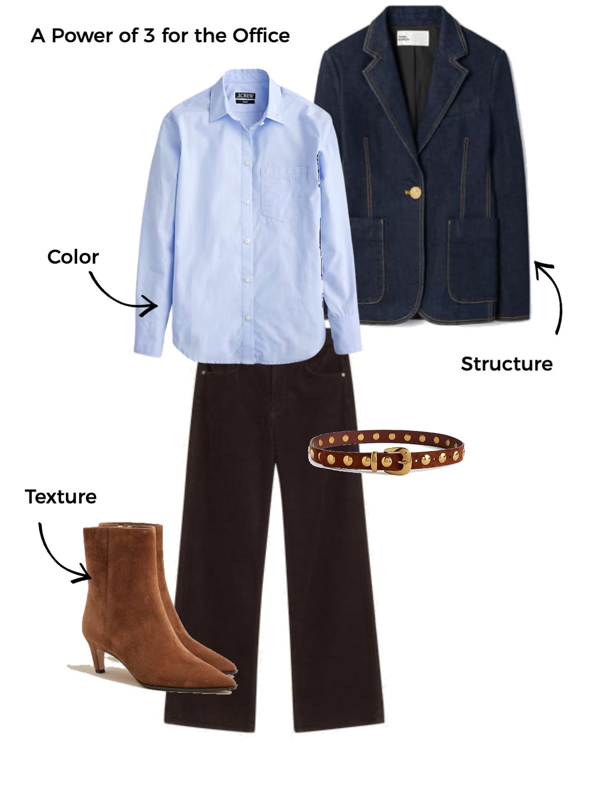 Baby blues. Loving any brown paired with baby blue this season. Think a brown suede jacket, heel, bag, or even just a belt with the prefect blue button down or sweater.