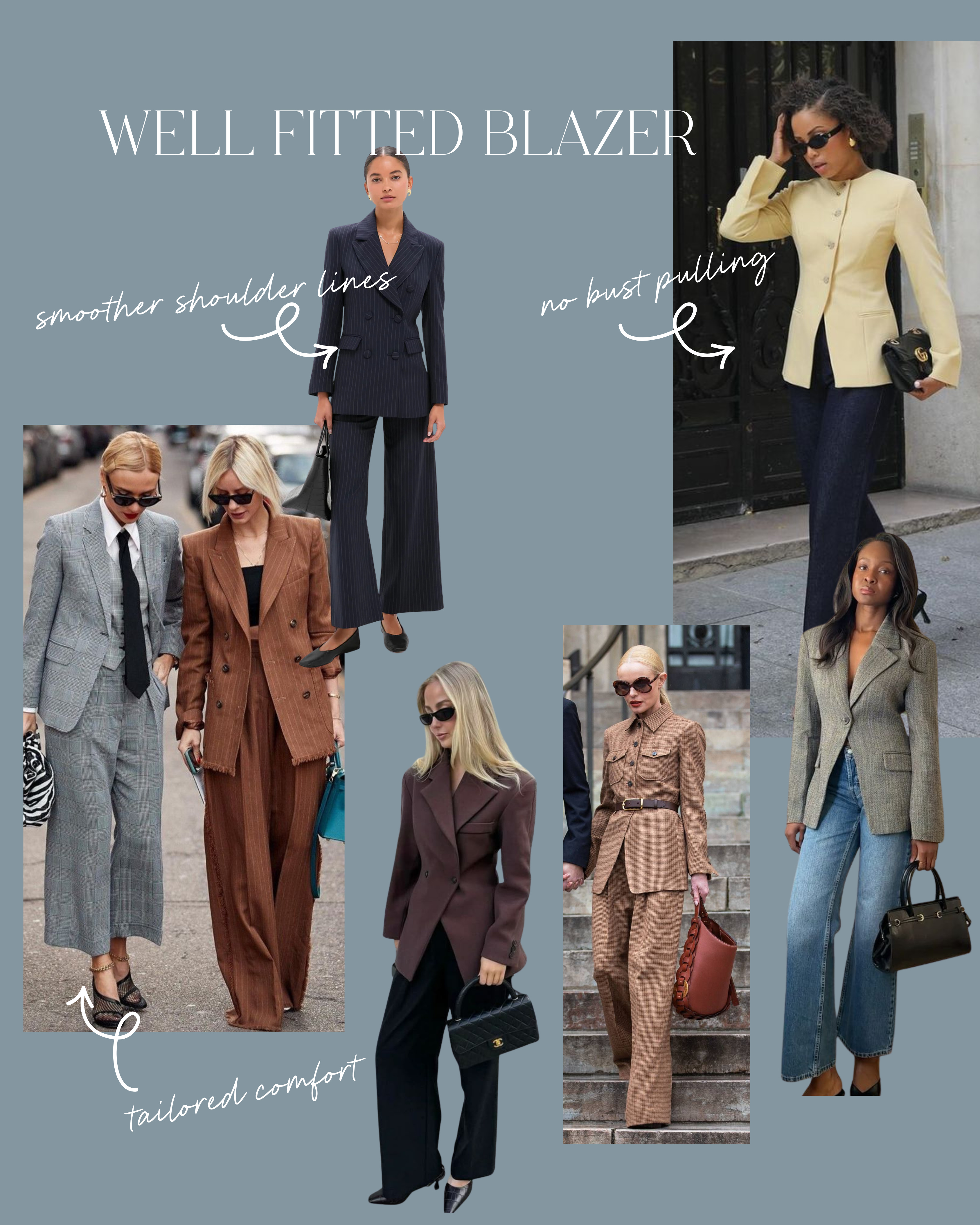 A properly tailored blazer has clean shoulder lines, no pulling across the bust, ease through the arms, transforms posture and energy.