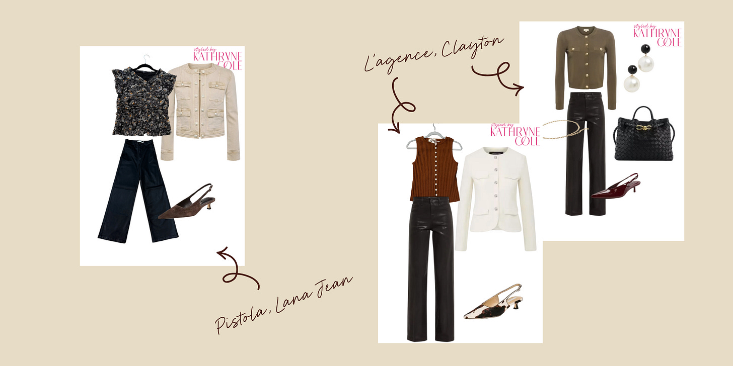 L’Agence, Clayton Jean — waxed denim that feels refined and modern. The longer lines are especially striking with heels, creating an elongated, polished silhouette that transitions easily from work to evening.