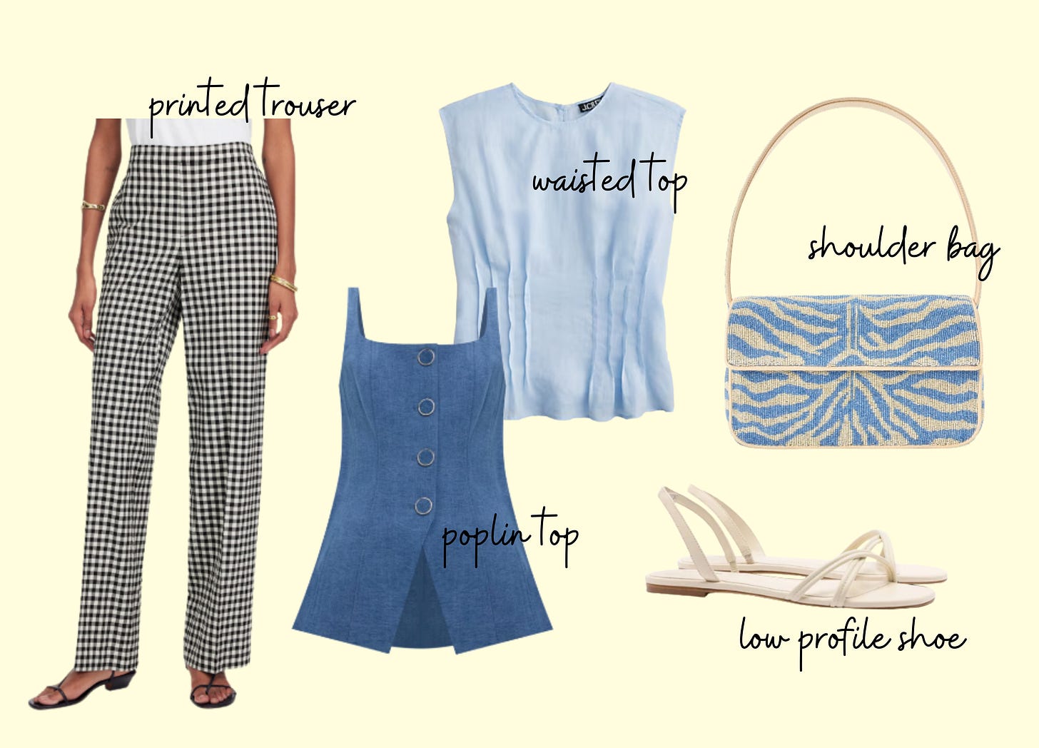 Printed Trouser + Poplin or Waisted Top + Low-Profile Shoe + Crossbody