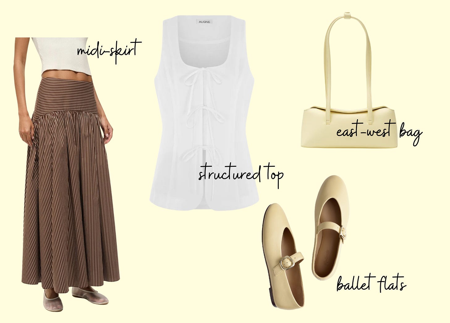 This is my go-to for days when I want to look refined without trying too hard. A breezy midi skirt is your summer workhorse—comfortable, flattering, and endlessly versatile. Pair it with a structured top (think: tailored tank, crisp button-up, or sleeveless knit), slip into classic ballet flats, and carry an oversized tote for a polished, functional finish.