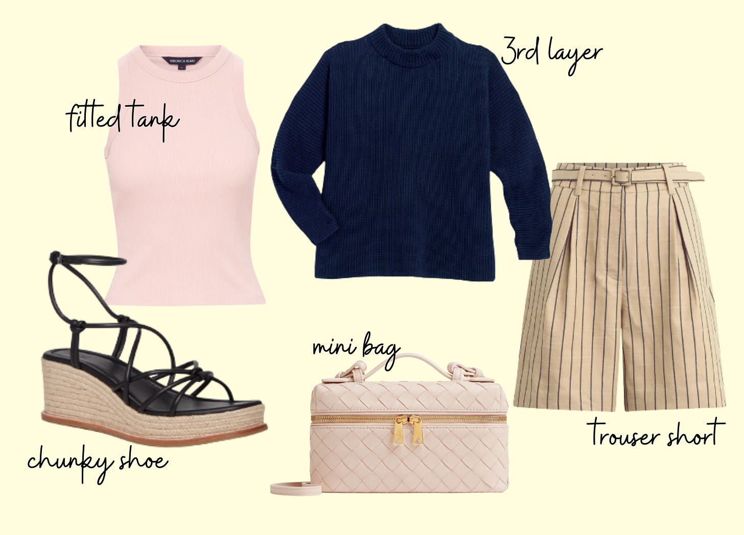 This is the formula that gives "off-duty model meets stylish mom on the go." Tailored trouser shorts (bonus points for pleats) keep it elevated, while a fitted tee keeps the base clean and easy. Add a belt to pull it together, a chunky sandal or sneaker for edge, and don’t forget your “third piece”—whether it’s an oversized shirt, a lightweight vest, or a cropped jacket. Finish with a mini bag for balance.