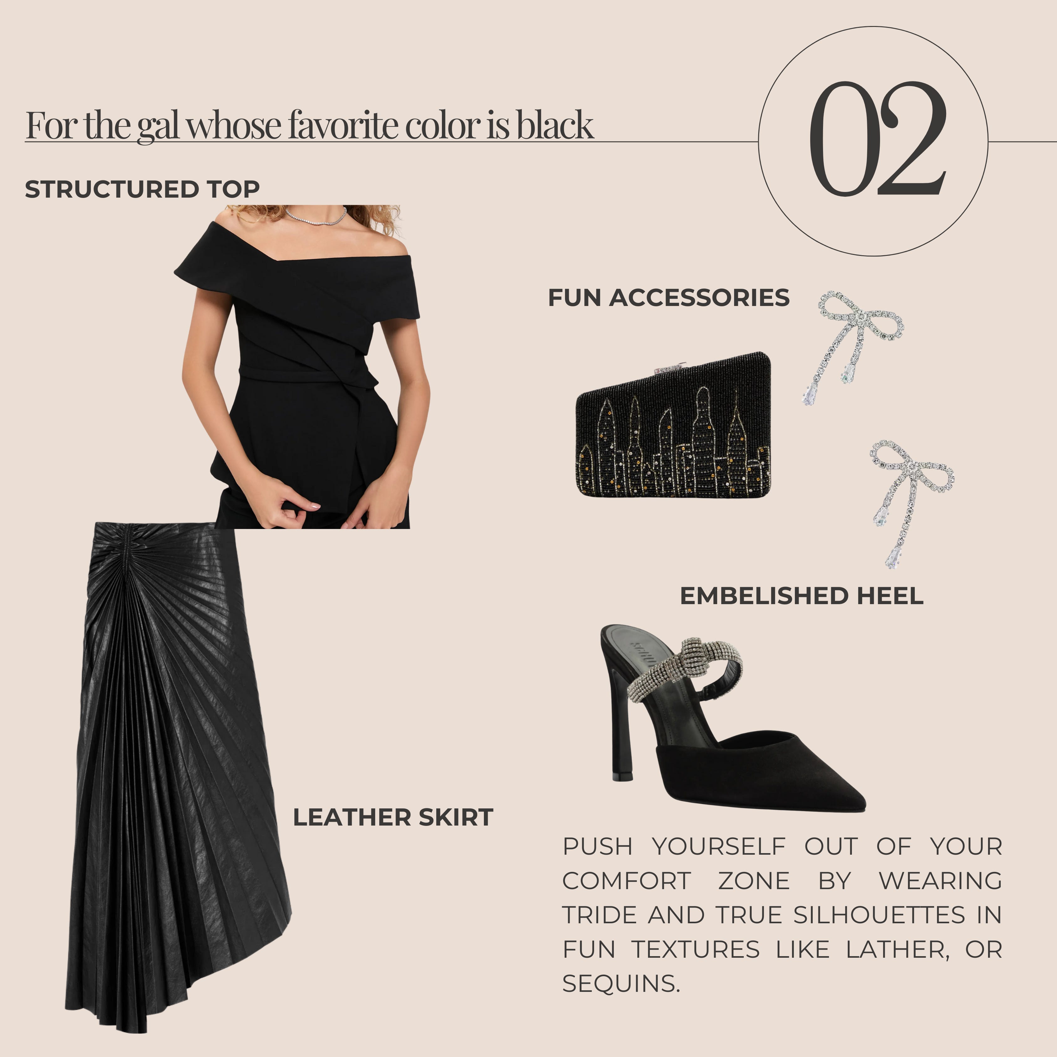 The Look: A structured black top paired with a leather skirt. Play with proportions—a fitted top with an A-line leather skirt or a boxy top with a sleek pencil skirt.