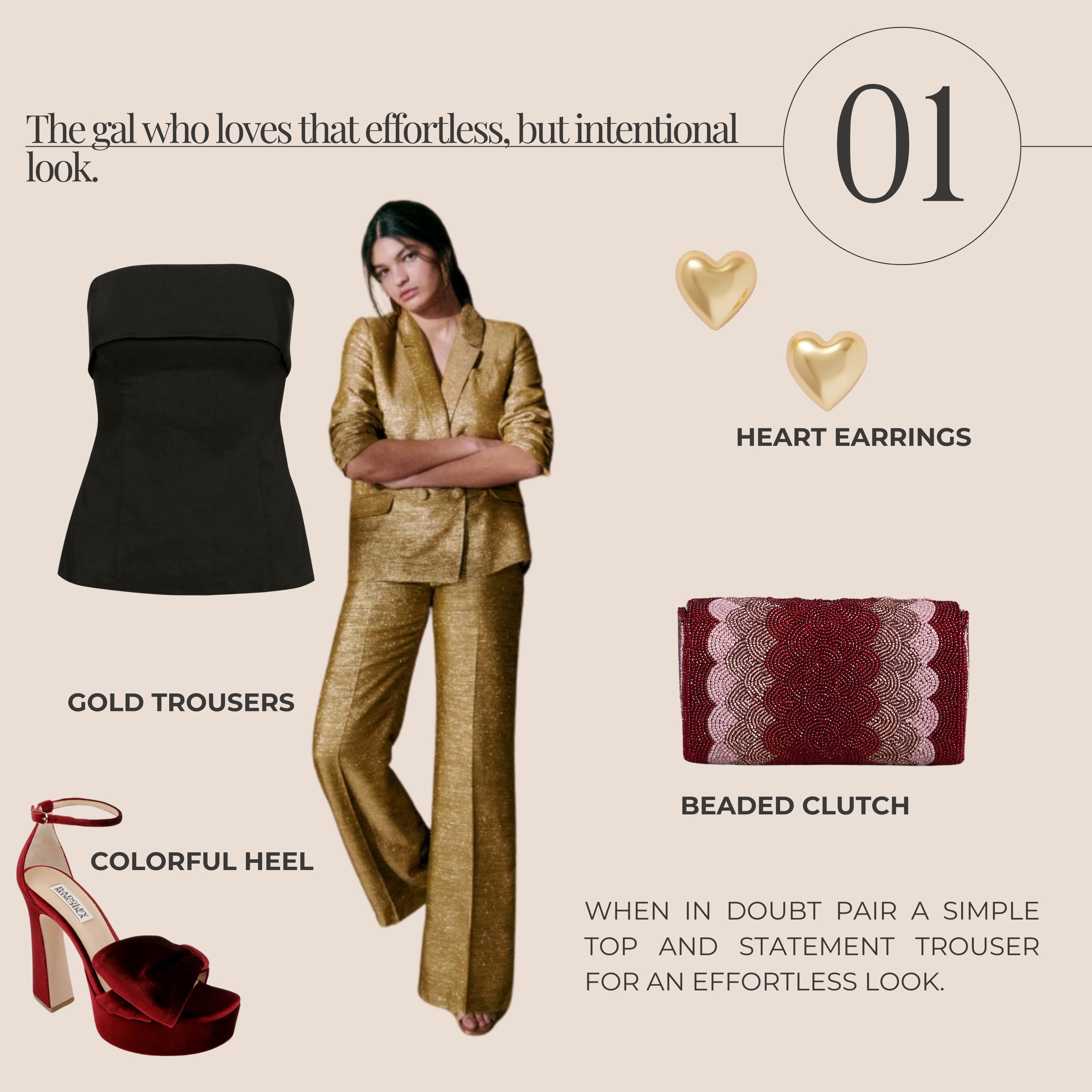 The Look: A simple, structured top paired with statement trousers. Think clean lines, elevated fabrics, and bold details like a metallic sheen or a tailored wide-leg fit.